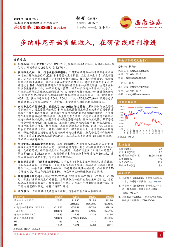 本报告分析了泽璟制药2021年半年报,认为公司多纳非尼的成功上市并贡献收入是重要的里程碑,在研管线的持续推进和研发投入的增加为公司未来的发展奠定了基础。维持“持有”评级,但同时也提示了研发进度和销售推广方面的风险。