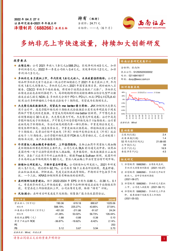 本报告分析了泽璟制药2021年年报,指出多纳非尼上市后快速放量,市场潜力巨大。公司持续加大研发投入,在研管线丰富,多个品种处于后期临床阶段,有望陆续获批上市,为公司业绩提供支撑。维持对泽璟制药的“持有”评级,但同时也提示了研发进度和销售推广方面的风险。