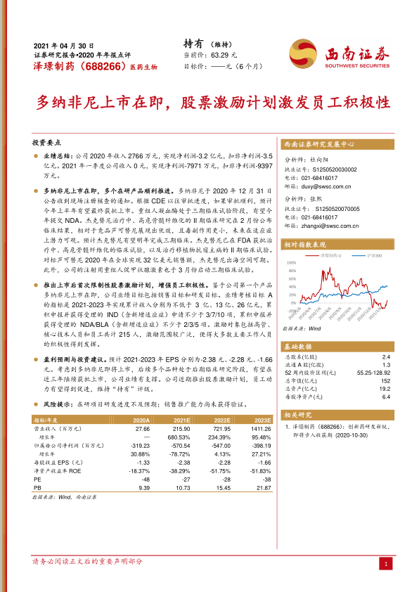 本报告分析了泽璟制药2020年年报,指出公司多纳非尼即将上市,多个在研产品临床试验进展顺利,且推出股权激励计划,有望促进公司业绩增长。维持“持有”评级,但需关注研发进度和销售推广能力。