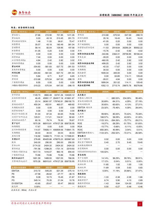 业绩总结: 公司 2020 年收入 2766 万元,实现净利润-3.2 亿元,扣非净利润-3.5亿元。 2021 年一季度公司收入 0 元,实现净利润-7971 万元,扣非净利润-9397万元。