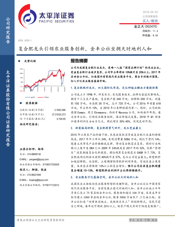 综合来看,金正大不仅是复合肥行业的确定性受益者,更是中国农业现代化转型浪潮中的先行者和创新者。公司从肥料制造商向综合性种植业解决方案提供商的战略转型,使其具备了超越传统制造业的成长潜力和更高的估值溢价。预计公司2018年和2019年净利润将分别达到11.95亿元和15.99亿元,对应EPS分别为0.38元和0.51元。考虑到金丰公社未来独立上市的市值增厚贡献,公司短期目标市值360亿元,中期目标市值550亿元,维持“买入”评级。投资者应关注原材料价格波动及金丰公社业务拓展进度不及预期的风险。