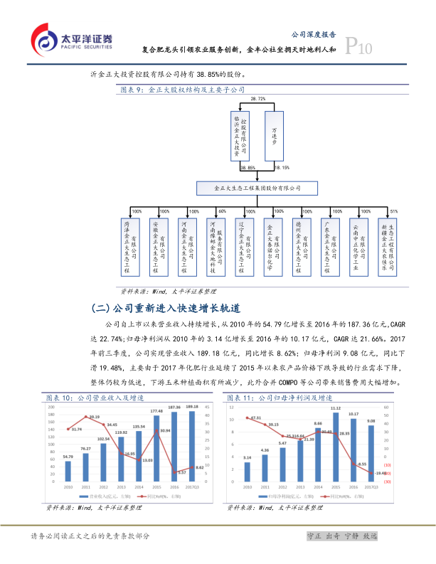 公司在2010年至2016年间实现了营业收入22.74%的复合年增长率和归母净利润21.66%的复合年增长率。尽管2017年前三季度受农产品价格低迷和并购整合费用增加影响,归母净利润有所下滑,但2018年第一季度预告归母净利润同比增长35%-45%,显示出良好的复苏开局。公司持续优化产品结构,高毛利的新型肥料(如硝基复合肥、水溶肥、盆栽土、植保产品等)营收占比和毛利贡献不断提升,例如园艺业务在2017年上半年毛利贡献已达33%。