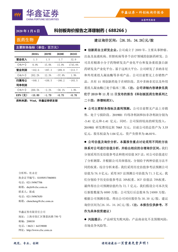 本报告对科创板公司泽璟制药(688266)进行了询价分析,核心观点如下: