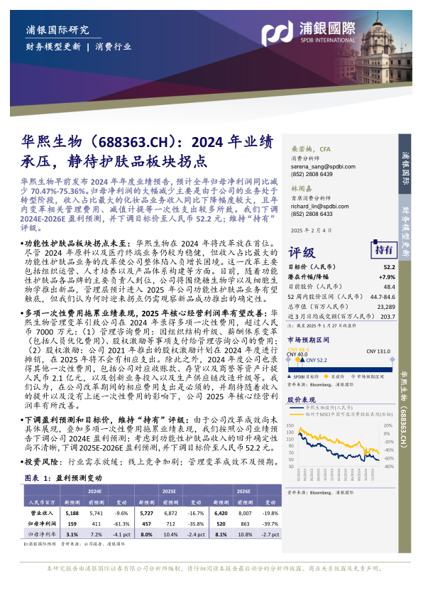 本报告分析了华熙生物2024年业绩预告,指出公司业绩承压主要由于功能性护肤品业务转型和一次性费用支出。虽然公司正在积极改革,但功能性护肤品业务的拐点尚未到来,未来业绩回升仍存在不确定性。因此,浦银国际下调了盈利预测和目标价,维持“持有”评级,并提示了相关投资风险。