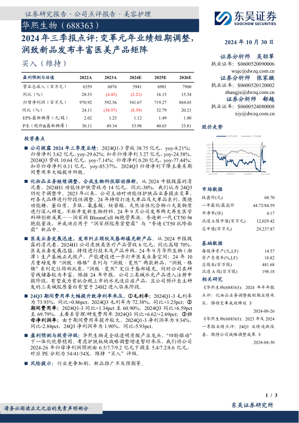 尽管短期业绩承压,但考虑到华熙生物在透明质酸产业的龙头地位和“四轮驱动”的稳固优势,东吴证券维持对公司“买入”评级,并预测未来几年公司业绩将逐步回升。