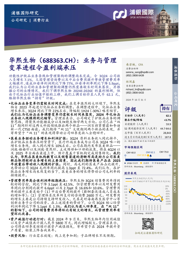 本报告分析了华熙生物(688363.CH)在业务和管理变革期间所面临的盈利压力,并基于公司业绩下调了2024E-2026E的盈利预测。尽管如此,考虑到化妆品行业估值中枢的上移,报告仍上调了目标价至人民币62.1元,维持“持有”评级。