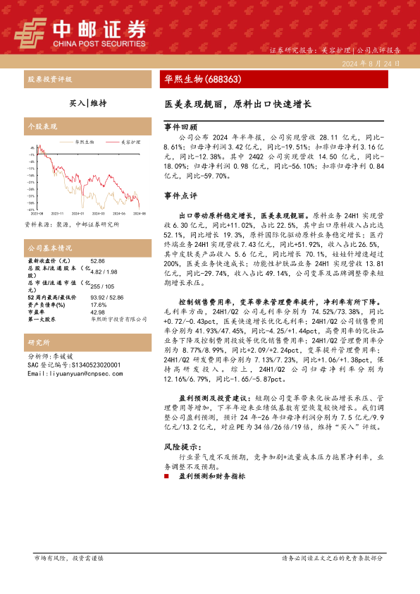 华熙生物在2024年上半年虽面临整体营收和净利润的短期下滑,但其核心医美业务和原料出口业务展现出强劲的增长势头,特别是医疗终端业务的皮肤类产品和娃娃针增速显著,原料出口占比过半并持续增长。尽管公司变革导致管理费用率上升和功能性护肤品业务短期承压,但通过医美业务的优化,毛利率得以保持,销售费用率也得到有效控制。分析师基于对公司下半年业绩恢复增长的预期,维持“买入”评级,并预测未来三年公司归母净利润将实现稳健增长。报告同时提示了行业景气度、市场竞争和业务调整不及预期等风险。总体而言,华熙生物在结构调整中展现出新的增长动力,长期投资价值值得关注。