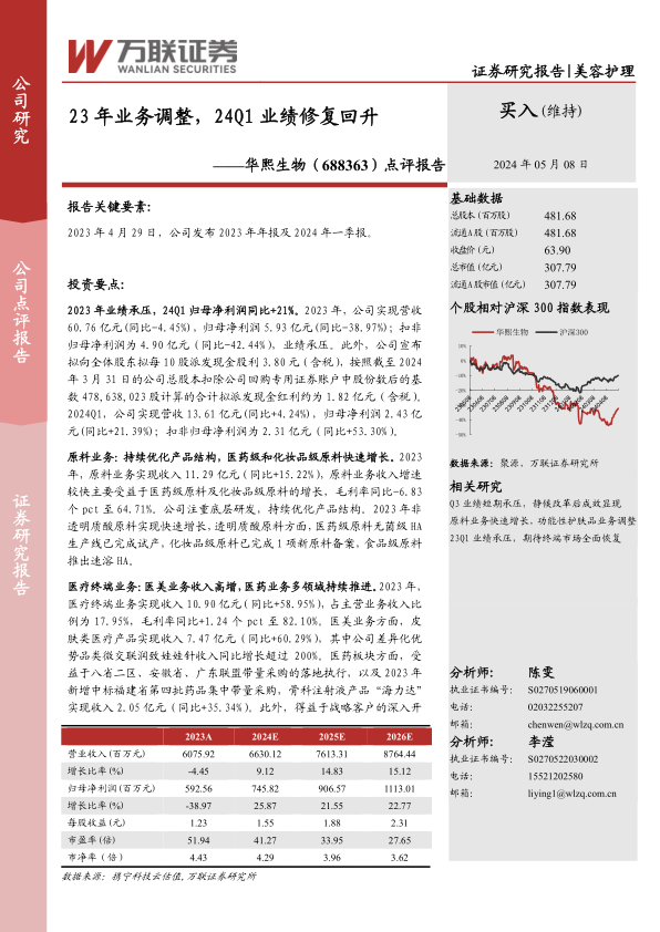华熙生物在2023年经历了业绩承压,营收和归母净利润均有所下滑,主要受功能性护肤品和功能性食品业务战略调整的影响。然而,公司通过优化产品结构、深化品牌形象和渠道调整等措施,在2024年第一季度实现了业绩的显著修复,归母净利润同比增长超过20%,显示出其业务韧性和调整成效。原料业务和医疗终端业务保持强劲增长,特别是医美业务表现突出。尽管面临经济下行、产品拓展不及预期和行业竞争加剧等风险,但公司通过积极的战略调整和持续的研发投入,有望在未来实现稳健增长。万联证券基于最新经营数据调整了盈利预测,并维持“买入”评级。