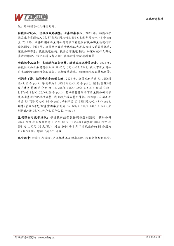 2023年,功能性护肤品业务实现收入37.57亿元,同比下降18.45%,毛利率同比下降4.44个百分点至73.93%。业务短期承压主要系公司主动对旗下功能性护肤品牌进行阶段性调整,重点优化以大单品为核心的品类体系、深化品牌形象、优化渠道结构(提升自营渠道占比)、加深核心人群渗透和维护,并实施数字化提质增效。