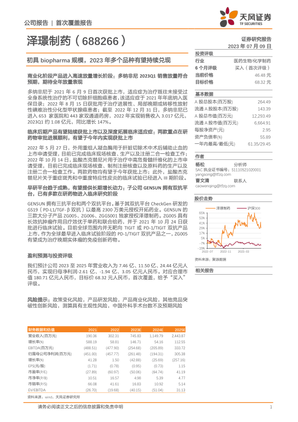 泽璟制药作为一家正逐步发展壮大的生物制药(biopharma)企业,在2023年展现出强劲的增长潜力。公司已建立起集创新药研发、生产和商业化于一体的完整体系,并在肿瘤、出血及血液疾病、免疫炎症性疾病和肝胆疾病等多个关键治疗领域进行了广泛布局。本报告首次覆盖泽璟制药,给予“买入”评级,目标价68.32元,对应合理市值180.71亿元人民币。