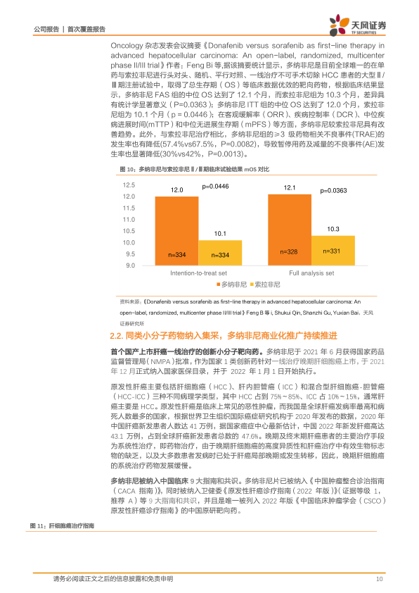 多纳非尼于 2021 年 6 月 9 日首次获批上市,适应症为治疗既往未接受过全身系统性治疗的不可切除肝细胞癌患者,该适应症于 2021 年年底纳入医保目录; 2022 年 8 月 15 日获批用于治疗进展性、局部晚期或转移性放射性碘难治性分化型甲状腺癌患者;截至 2022 年 12 月 31 日,多纳非尼已进入 653 家医院和 443 家双通道药房, 2022 年实现销售收入 3.017 亿元,2023Q1 约 1.08 亿元,同比增长 147%。