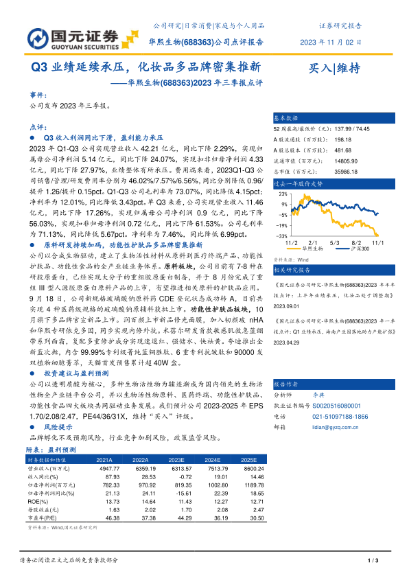 公司以透明质酸为核心,多种生物活性物为辅逐渐成为国内领先的生物活性物全产业链平台公司,并以生物活性物原料、医药终端、功能性护肤品、功能性食品四大板块共同驱动业务发展。我们预计公司2023-2025年EPS1.70/2.08/2.47,PE44/36/31X,维持“买入”评级。