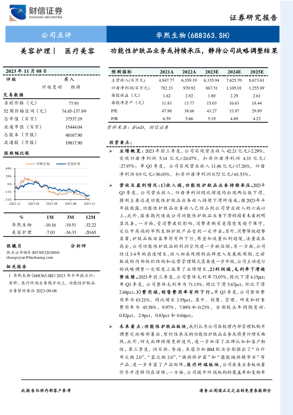 本报告核心观点指出,华熙生物在2023年前三季度面临业绩压力,特别是功能性护肤品业务持续承压,导致营收和归母净利润出现两位数下滑。公司正主动进行内部管理机制梳理和战略调整,以应对消费市场变化和内部发展瓶颈。尽管短期业绩承压,但报告维持“买入”评级,认为随着战略调整的逐步落地,功能性护肤品业务有望重回增长曲线,同时医疗终端和原料业务作为新的增长引擎,将共同驱动公司长期发展。