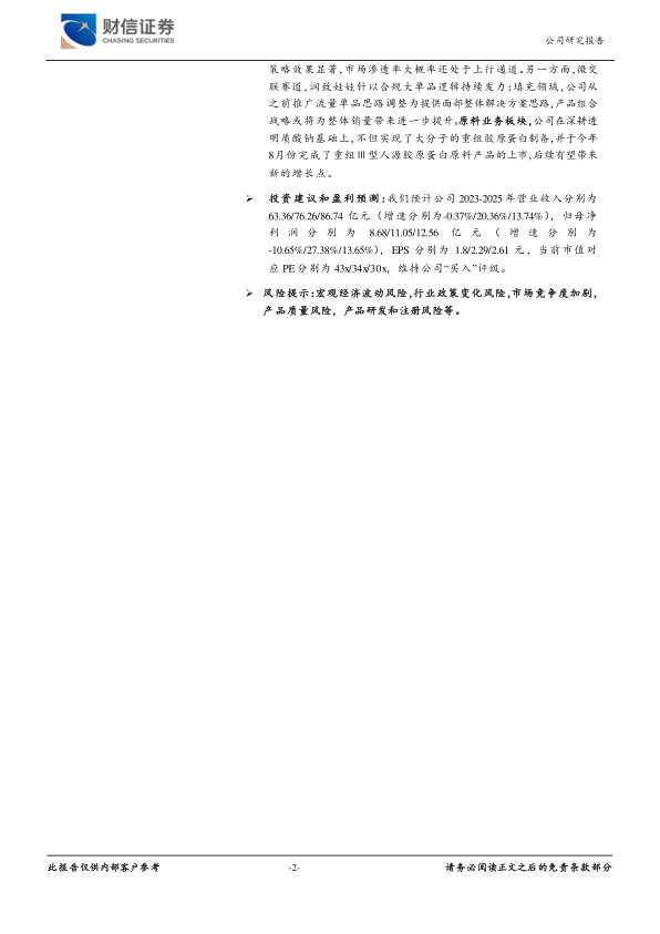 财信证券预计华熙生物2023-2025年营业收入分别为63.36亿元、76.26亿元和86.74亿元,增速分别为-0.37%、20.36%和13.74%。归母净利润分别为8.68亿元、11.05亿元和12.56亿元,增速分别为-10.65%、27.38%和13.65%。对应的每股收益(EPS)分别为1.80元、2.29元和2.61元。当前市值对应PE分别为43倍、34倍和30倍。鉴于公司未来的增长潜力,报告维持“买入”评级。