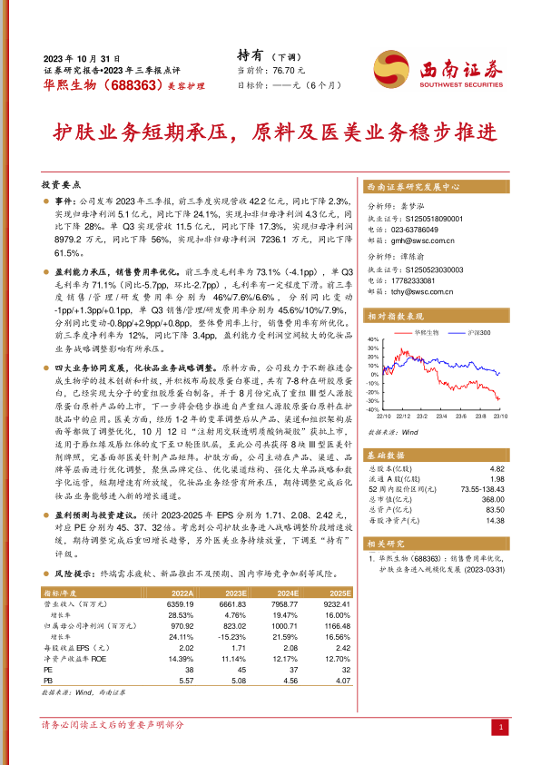 本报告分析了华熙生物2023年三季报,指出公司短期内面临护肤业务战略调整带来的压力,但原料和医美业务稳步发展。公司在积极进行业务调整和战略布局,长期来看有望重回增长轨道。考虑到护肤业务的调整期,下调至“持有”评级,并提示了相关风险。