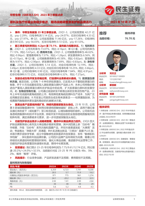本报告对华熙生物2023年三季度业绩进行了深入分析,探讨了其原料及医疗终端业务的稳健发展,并着重关注了战略调整对功能性护肤品业务的影响。报告旨在评估公司短期业绩压力下的长期发展潜力,并为投资者提供参考建议。