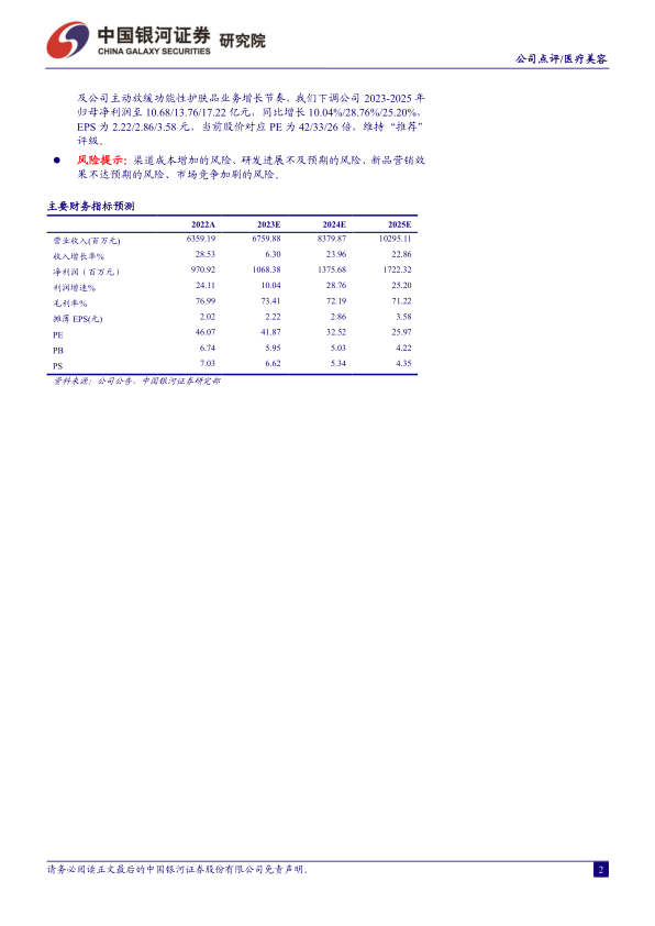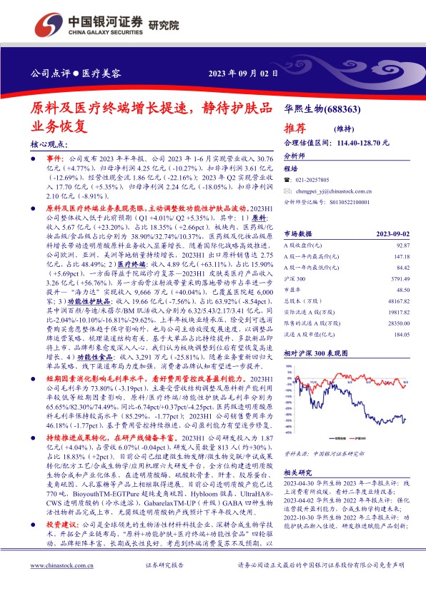 投资建议: 公司是全球领先的生物活性材料科技企业,深耕合成生物学技术,开拓全产业链布局,“原料+功能护肤+医疗终端+功能性食品”四轮驱动,品牌矩阵丰富,长期成长性良好。 考虑到终端消费复苏不及预期,以及公司主动放缓功能性护肤品业务增长节奏,我们下调公司 2023-2025 年归母净利润至 10.68/13.76/17.22 亿元,同比增长 10.04%/28.76%/25.20%,EPS 为 2.22/2.86/3.58 元,当前股价对应 PE 为 42/33/26 倍,维持“推荐”评级。