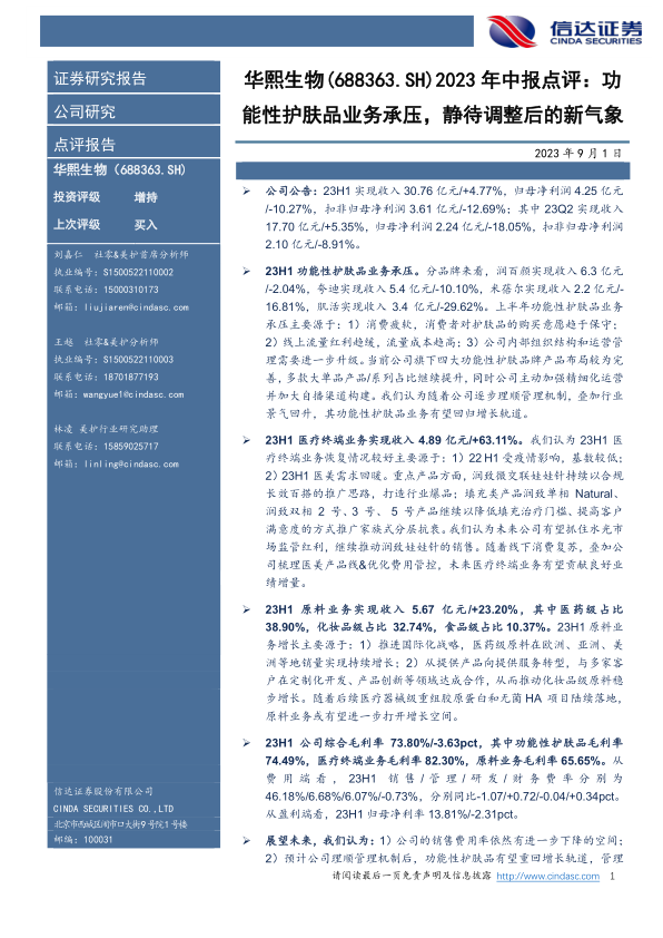 2023年中报点评:功能性护肤品业务承压,静待调整后的新气象