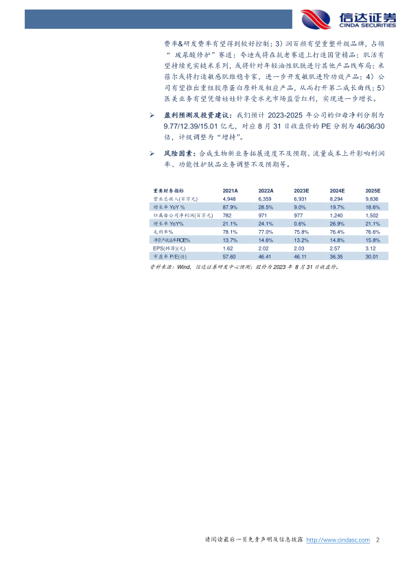 风险因素:合成生物新业务拓展速度不及预期、流量成本上升影响利润率、功能性护肤品业务调整不及预期等。