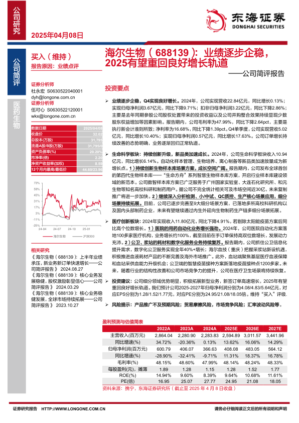海尔生物在2024年业绩逐步企稳,并在Q4实现了良好的增长。生命科学板块通过持续创新和拓展细分场景,展现出强劲的增长动力。医疗创新板块的医院用药自动化业务表现出色,公卫和浆站业务也在持续复苏。维持“买入”评级,并对公司未来几年的盈利能力持乐观态度。