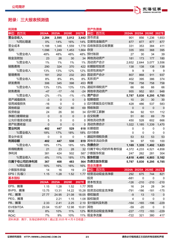 预计公司2025-2027年归母净利润分别为4.08/4.83/5.64亿元,对应EPS分别为1.28/1.52/1.77元,对应PE分别为24.95/21.08/18.05倍。