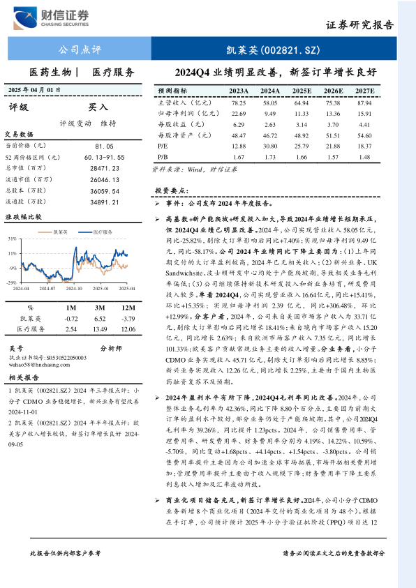 盈利预测与投资建议:2025-2027年,预计公司实现归母净利润11.33/13.36/15.91亿元,EPS分别为3.14/3.70/4.41元,当前股价对应的PE分别为25.79/21.88/18.37倍。考虑到:(1)医药生物行业投融资呈现回暖,公司新签订单保持较快增长,业绩有望改善;(2)截止2025年4月1日,根据Wind一致预期,可比公司药明康德、康龙化成、皓元医药2025年业绩对应的PE分别为17.59、27.25、35.42倍,平均值为26.75倍;给予公司2025年25-30倍PE,对应的目标价格为78.50-94.20元/股,维持公司“买入”评级。