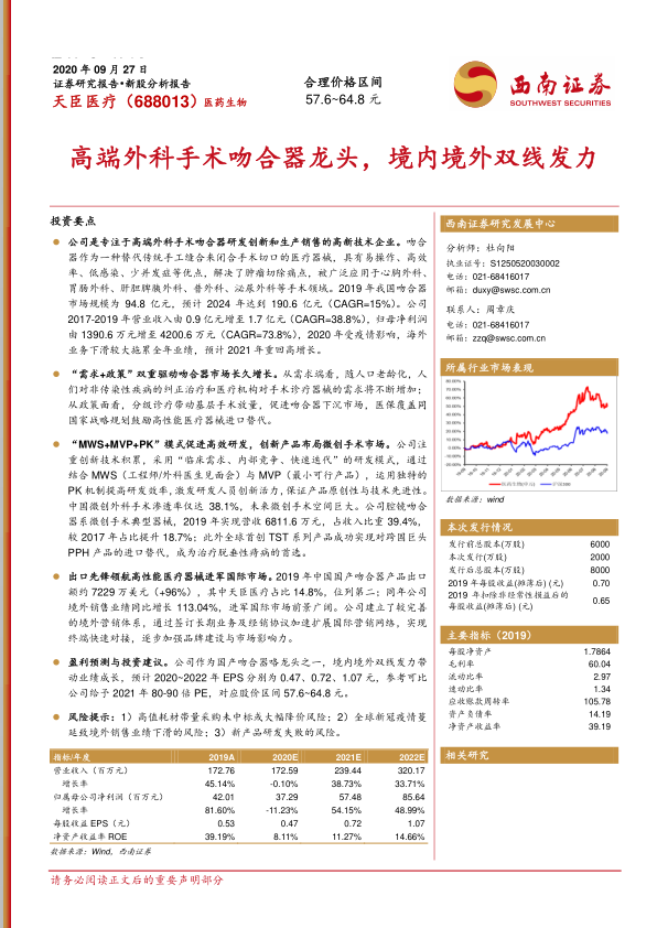 选取科创板高值耗材相关公司(心脉医疗、爱博医疗、三友医疗、南微医学)作为可比公司。这些可比公司2021年平均市盈率(PE)为88倍。考虑到天臣医疗作为一家立足于全球竞争市场的高端外科手术吻合器公司,凭借其产品技术先进性及研发模式创新性,有望实现国内进口替代和国际市场开拓双线发力,未来业绩向好。因此,给予公司2021年80-90倍PE估值,对应股价区间为57.6~64.8元/股。