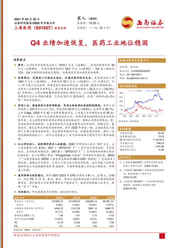 盈利预测与投资建议。预计2021-2023年EPS分别为1.81元、2.10元、2.42元,对应PE为11倍、9倍、8倍。考虑公司医药商业进口品种与新冠疫苗放量增长,同时医药工业在保障原料及产能供应下,赢得仿制药核心竞争力,维持“买入”评级。