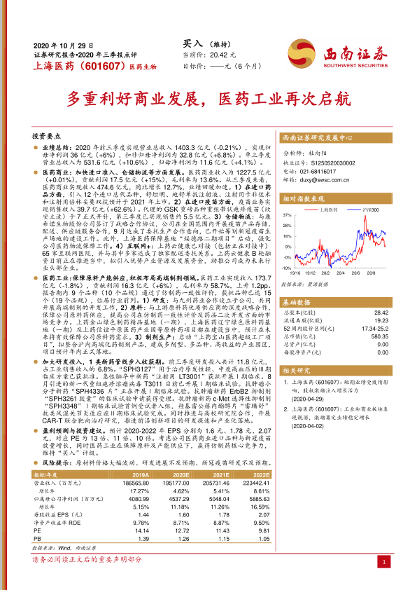 上海医药2020年三季报显示,公司医药商业板块受益于进口药品和疫苗业务的增长,业绩回暖加速;医药工业板块通过保障原料供应和布局高端制剂领域,提升了核心竞争力;研发投入加大,多个创新药进入临床试验阶段,为未来增长提供动力。综合来看,公司多重利好因素叠加,发展前景良好,维持“买入”评级。