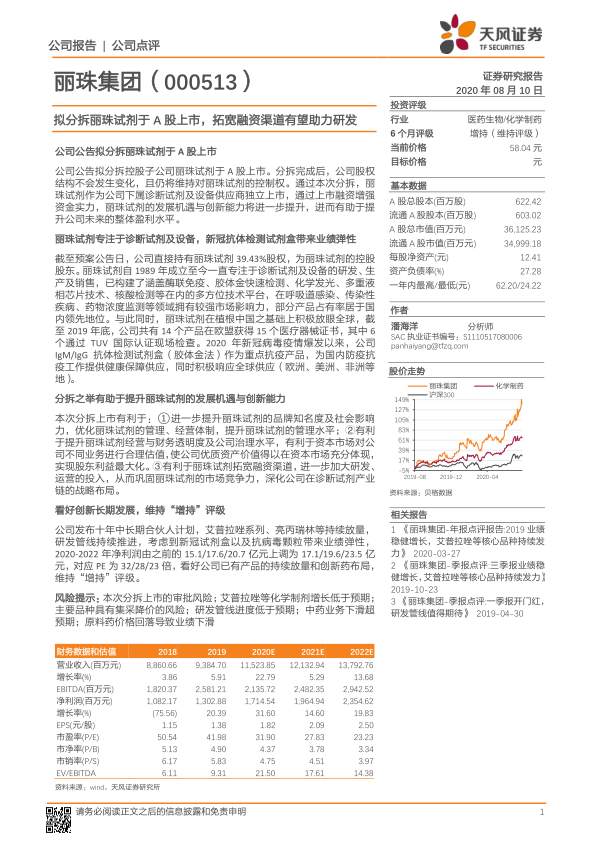 公司发布十年中长期合伙人计划,艾普拉唑系列、亮丙瑞林等核心品种持续放量,研发管线持续推进。考虑到新冠试剂盒以及抗病毒颗粒带来的业绩弹性,天风证券研究所上调了丽珠集团2020-2022年净利润预测。