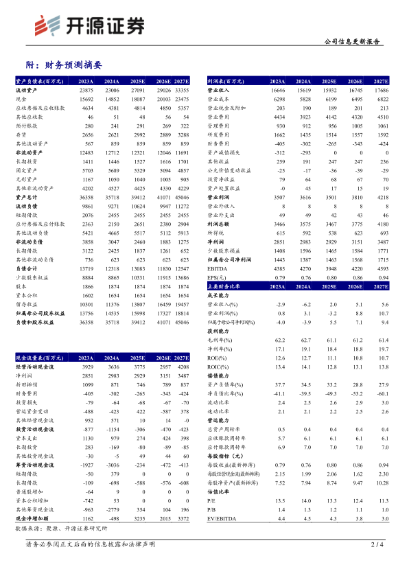 2024年,健康元经营性现金流净额达到36.36亿元,显示出公司良好的现金创造能力。公司通过回购股份和分红等方式,持续完善股东回报机制。目前,公司正处于产品换挡期,随着妥布霉素和舒列迭等新产品进一步放量,以及TG-1000等创新药逐步贡献增量收入,健康元的创新价值属性有望进一步凸显,为公司带来长期增长潜力。