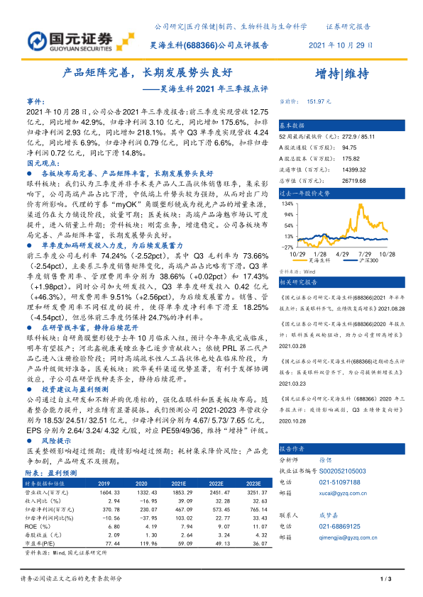 昊海生科2021年三季报显示,公司营收和利润实现显著增长,但单季度业绩有所波动。公司在眼科、医美和骨科等领域布局完善,产品矩阵丰富,具备长期发展的良好势头。同时,公司加大研发投入,为未来发展蓄力。维持“增持”评级,但需关注医美整顿、疫情、耗材集采以及产品竞争等风险。
