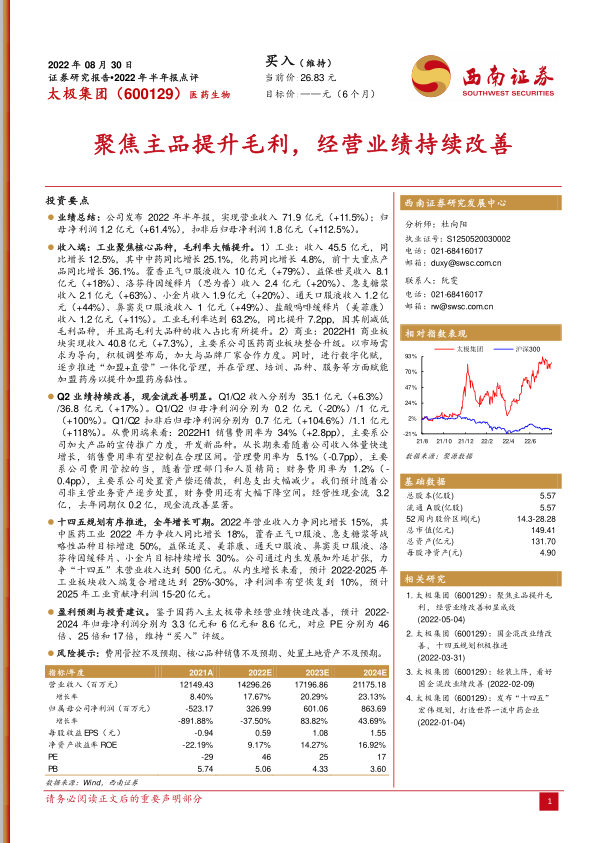 本报告分析了太极集团(600129)2022年半年度报告,核心观点如下: