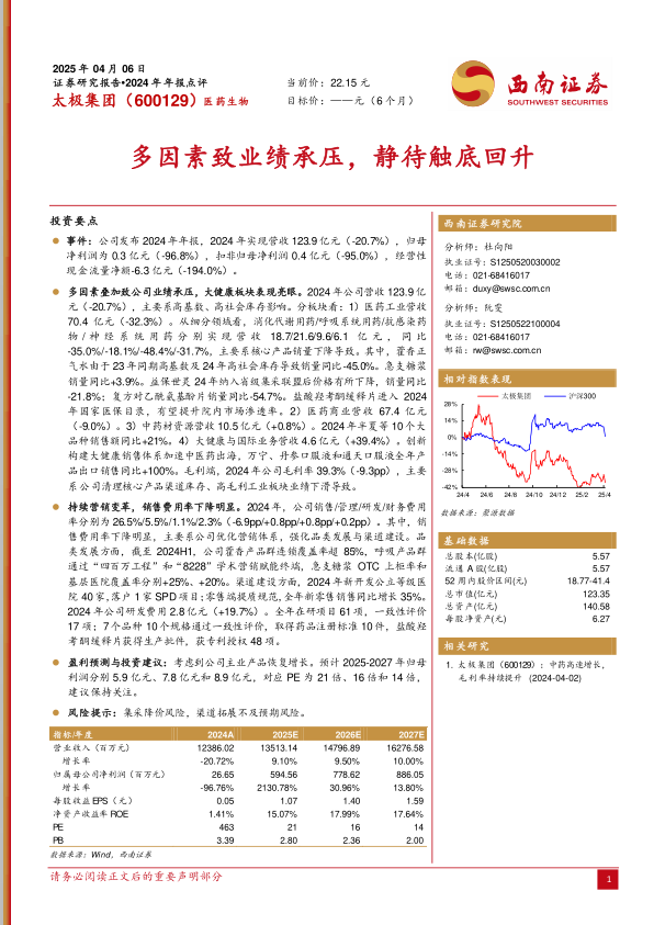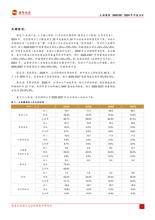 太极集团2024年业绩受高基数和高社会库存等多重因素影响,营收和净利润均出现显著下滑,经营现金流承压。然而,公司在挑战中积极调整,大健康与国际业务板块实现高速增长,中医药出海成效显著。同时,公司通过营销体系变革有效降低了销售费用率,并持续加大研发投入,为未来发展积蓄动能。展望2025-2027年,随着主业产品逐步恢复增长,以及各项战略举措的深入推进,公司盈利能力有望实现强劲复苏。尽管面临集采降价和渠道拓展不及预期等风险,但其在营销效率提升和研发创新方面的努力,以及大健康业务的增长潜力,为公司未来的发展提供了积极的支撑。