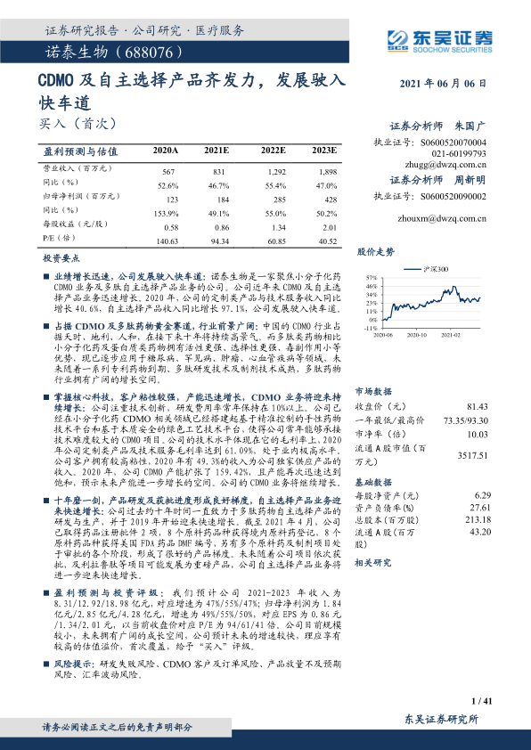 业绩增长迅速,公司发展驶入快车道:诺泰生物是一家聚焦小分子化药CDMO业务及多肽自主选择产品业务的公司。公司近年来CDMO及自主选择产品业务迅速增长。2020年,公司的定制类产品与技术服务收入同比增长40.6%,自主选择产品收入同比增长97.1%,公司发展驶入快车道。