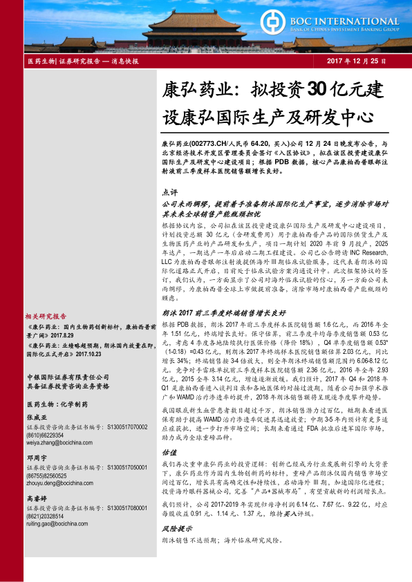 本报告分析了康弘药业拟投资建设康弘国际生产及研发中心的事件,认为此举是公司为康柏西普国际化战略做出的重要布局,有助于消除市场对其产能瓶颈的担忧。同时,报告分析了朗沐的销售增长情况和市场潜力,认为其受益于医保覆盖和市场渗透率的提升,未来销售额有望持续攀升。维持对康弘药业的买入评级,但提醒投资者注意朗沐销售不达预期和海外临床研究风险。
