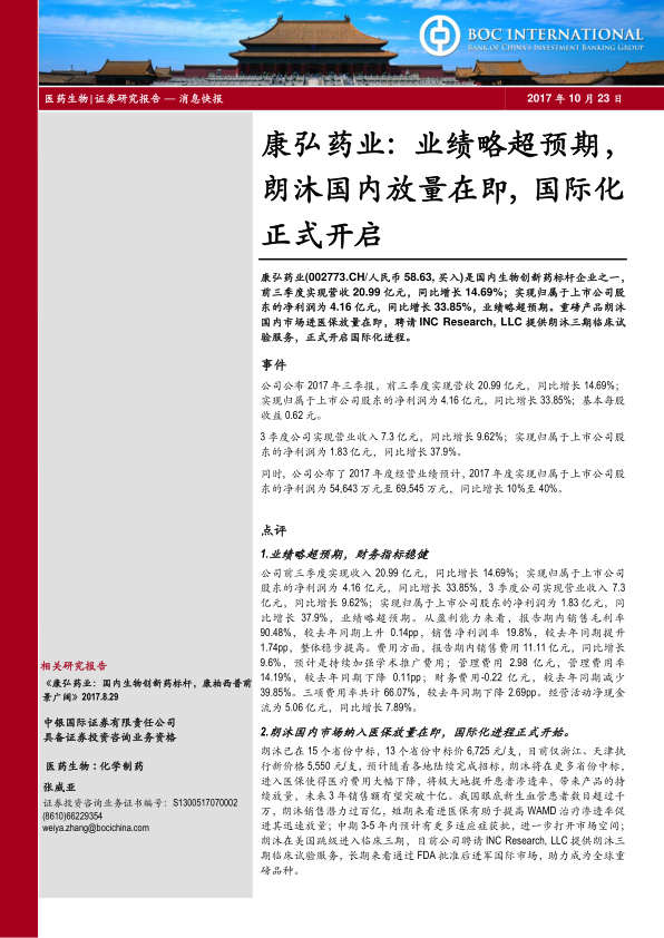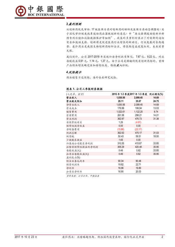 本报告分析了康弘药业2017年三季报,指出公司业绩略超预期,盈利能力稳步提升。核心产品朗沐在国内市场纳入医保后有望迎来放量增长,同时公司积极推进国际化进程。在政策利好的背景下,康弘药业作为国内生物创新药标杆企业,未来发展前景广阔,维持“买入”评级。但同时也提示了朗沐销售不达预期以及海外临床研究的风险。