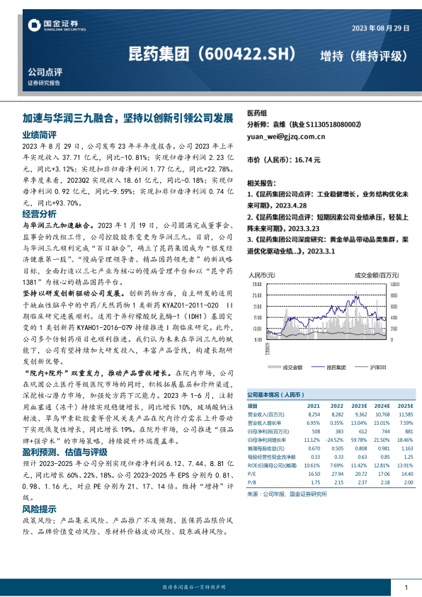 昆药集团2023年上半年在营收略有下降的情况下,通过有效的经营管理实现了归母净利润和扣非归母净利润的显著增长,尤其第二季度扣非净利润表现亮眼。公司与华润三九的战略融合为其带来了新的发展机遇和清晰的战略定位。在研发创新和“院内+院外”市场双重发力策略的推动下,公司核心产品销售表现良好,未来业绩增长潜力可期。尽管面临多重市场风险,但基于其战略转型和经营改善,分析师对其未来盈利能力持乐观态度,并维持“增持”评级。