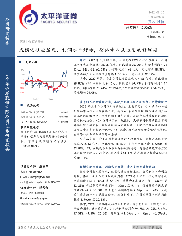 开立医疗在2022年上半年表现出色,营收和利润均实现显著增长。这主要得益于公司多年来在研发和市场方面的持续投入,以及高端产品在市场上的成功推广。规模化效应的显现和费用控制的加强,进一步提升了公司的盈利能力。太平洋证券维持对开立医疗的“买入”评级,并上调了未来几年的业绩预期,认为公司将继续保持良好的增长势头。