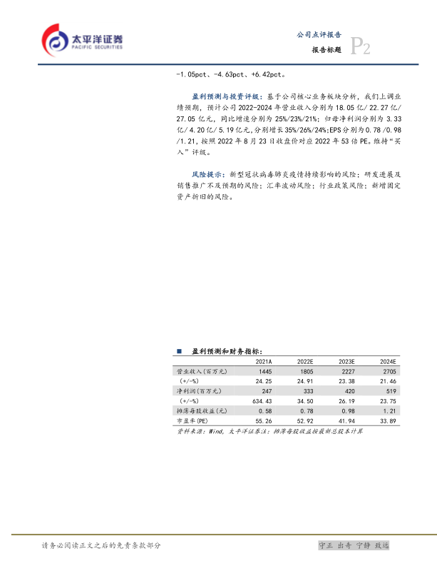 基于公司核心业务板块分析,上调业绩预期,预计公司2022-2024年营业收入分别为18.05亿/ 22.27亿/ 27.05 亿元,同比增速分别为 25%/23%/21%;归母净利润分别为 3.33 亿/ 4.20亿/ 5.19亿元,分别增长35%/26%/24%;EPS分别为0.78 /0.98 /1.21,按照2022年8月23日收盘价对应2022年53倍PE。维持“买入”评级。