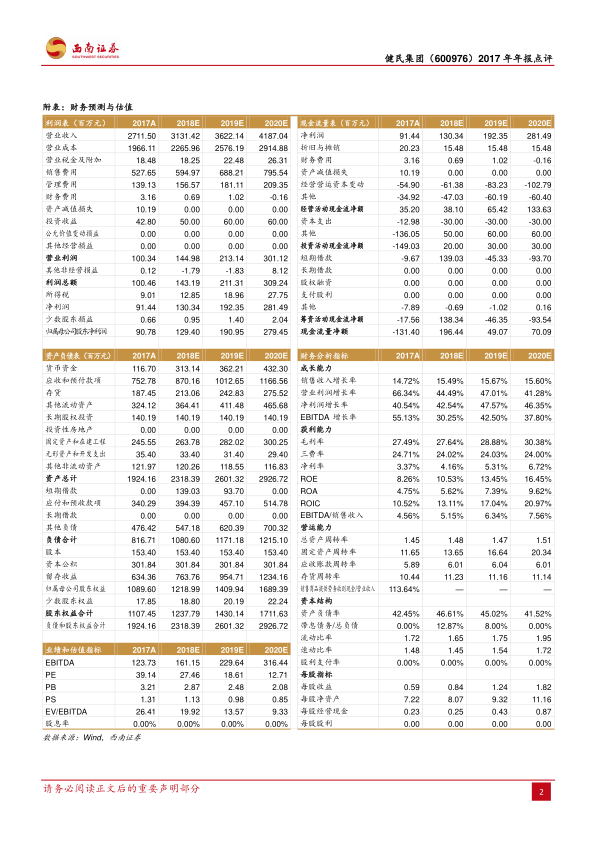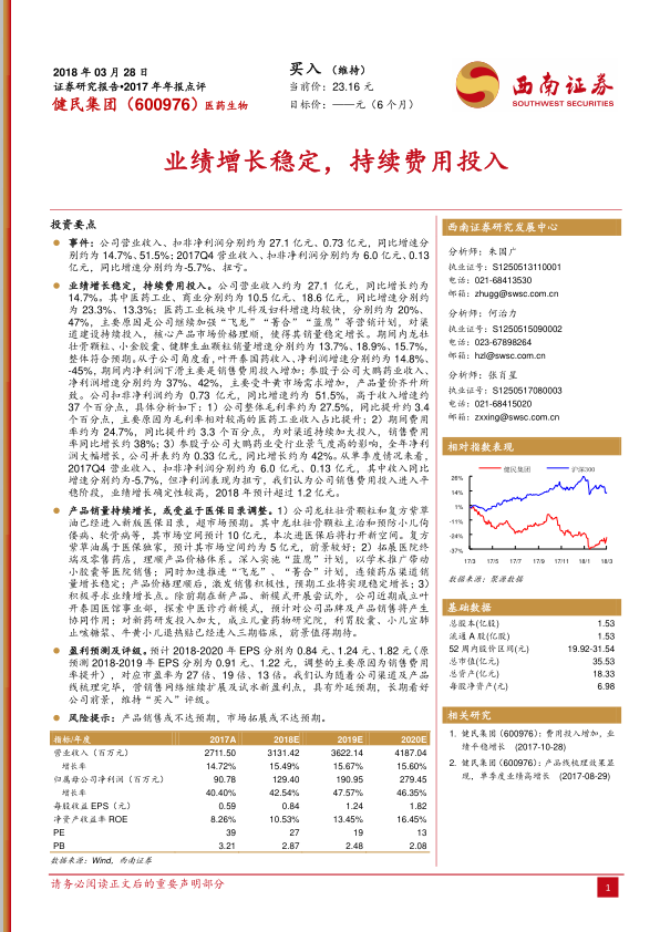 健民集团2017年业绩表现稳健,营业收入和扣非净利润均实现增长,尤其扣非净利润增速显著。公司通过持续的销售费用投入和渠道建设,有效推动了医药工业板块,特别是儿科和妇科产品的快速增长。核心产品进入新版医保目录,为公司打开了新的市场空间。同时,公司积极探索新业务模式和加大研发投入,为未来的可持续发展奠定了基础。尽管面临销售费用投入增加的挑战,但毛利率的提升和参股子公司的良好表现有效支撑了净利润增长。基于对公司渠道和产品线优化、市场拓展以及新盈利点尝试的积极预期,报告维持“买入”评级,并对未来盈利能力持乐观态度。