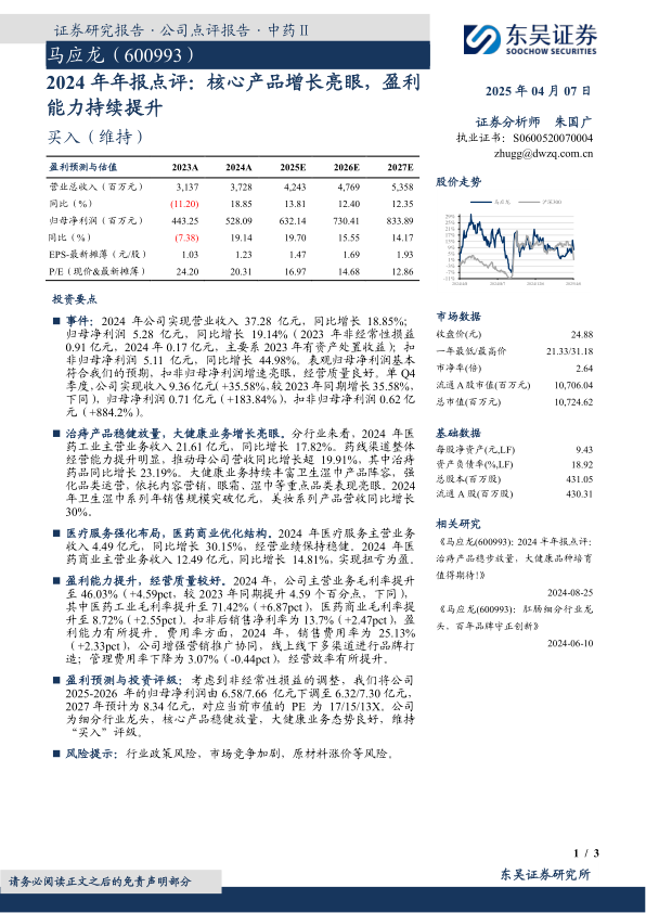 马应龙2024年年报显示,公司核心产品增长亮眼,大健康业务表现突出,盈利能力持续提升。医药工业和医药商业均有良好表现,医疗服务稳健增长。虽然非经常性损益对净利润有一定影响,但整体经营质量良好。维持“买入”评级,但需关注行业政策、市场竞争和原材料涨价等风险。