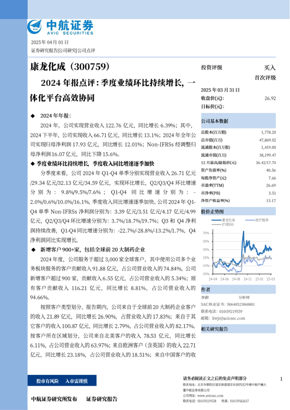 我们预计公司2025-2027年EPS分别为0.98元、1.17元和1.41元,对应的动态市盈率分别为27.44倍、23.07倍和19.10倍。公司是行业领先的全流程一体化医药研发服务平台,在药物发现、临床前及早期临床研究方面处于行业领先地位,同时拓展了包括临床后期开发及商业化生产在内的下游业务能力,并通过国际化运营及管理手段,在全球范围内为客户提供全面的服务。在医药行业需求回暖的背景下,公司坚持“全流程、一体化、国际化、多疗法“的战略,有望受益于全球新药研发投入的持续增长和外包率的不断提升,并不断扩大市场份额,实现高于行业水平的增长。首次覆盖,给予买入评级。