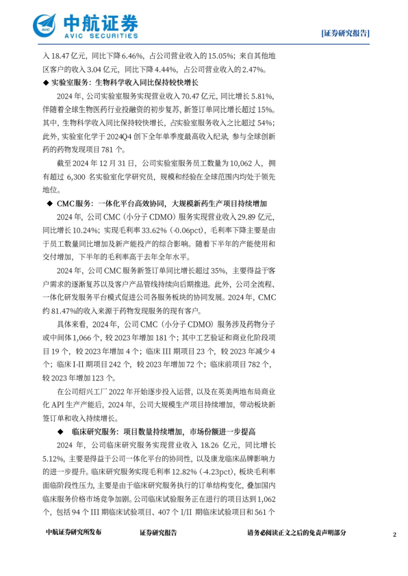 2024年,公司CMC(小分子CDMO)服务实现营业收入29.89亿元,同比增长10.24%;实现毛利率33.62%(-0.06pct),毛利率下降主要是由于员工数量同比增加及新产能投产的综合影响。随着下半年的产能使用和交付增加,下半年的毛利率高于去年全年水平。