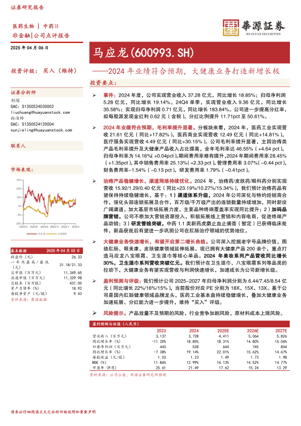 大健康业务快速增长,有望开启第二增长曲线。公司深入挖掘老字号品牌价值,围绕肛肠、眼美康、皮肤健康领域延伸拓展,现已拥有大健康产品200余个,重点打造马应龙八宝眼霜、卫生湿巾等核心单品。2024年美妆系列产品营收同比增长30%,卫生湿巾系列营收突破亿元。我们预计在卫生湿巾、八宝眼霜系列等品类的拉动下,大健康业务有望实现营收与利润快速增长,加速成长为公司新增长级。