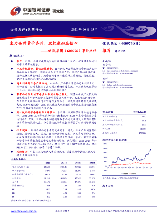 股权激励附带条件彰显业绩信心。本次股权激励解禁附带业绩考核条件,2021-2023三年考核的净利润指标相比于2020年复合增速至少要达到年化20%,且考核净利润将剔除联营公司武汉健民大鹏药业有限公司带来的投资收益。公司股权激励考核指标彰显了对业绩增长的信心。
