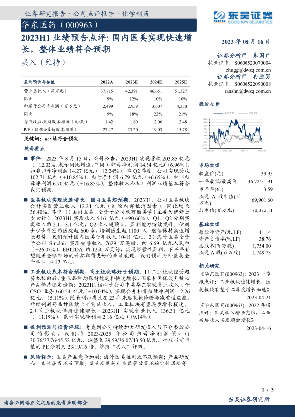 华东医药2023年半年度业绩符合预期,其中医美板块表现亮眼,国内医美业务增长超预期,海外医美业务也实现盈利。工业板块保持稳健增长,未来有望加速。东吴证券维持“买入”评级,但下调了盈利预测,并提示了相关风险。总体来看,华东医药在医美和医药领域均具备较强的竞争力,值得关注。