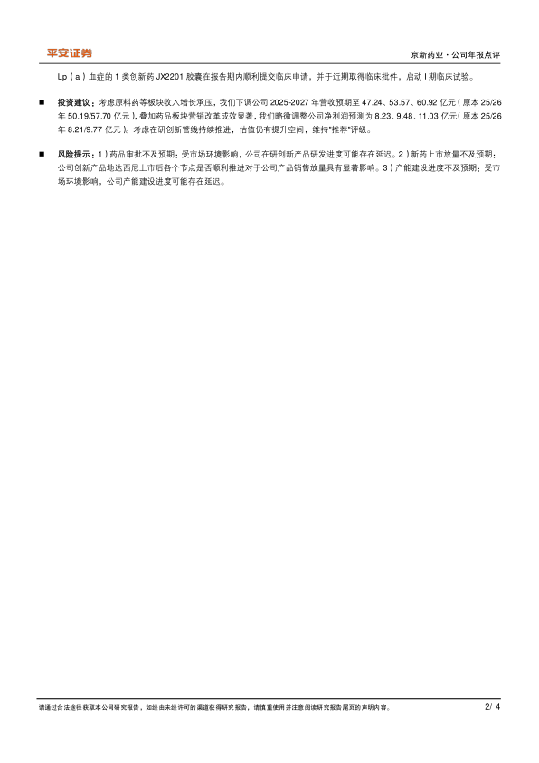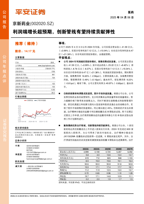 京新药业2024年业绩表现超预期,利润端实现快速增长,销售控费成效显著。公司在仿制药和创新药领域均有积极进展,尤其是在院外市场拓展和创新管线研发方面。维持“推荐”评级,但同时也提示了药品审批、新药放量和产能建设等方面的风险。
