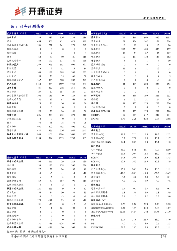 公司发布2024年度报告,营收8.68亿元,同比增加22.46%;归母净利润1.77亿元,同比增加28.26%;扣非归母净利润1.70亿元,同比增长35.23%;毛利率84.56%,对比2023年81.87%有所提升。我们维持2025-2026年并新增2027年盈利预测,预计2025-2027年归母净利润为1.78/2.02/2.26亿元,对应EPS为2.28/2.58/2.88元/股,对应当前股价PE为21.5/19.0/17.0倍,维持“增持”评级。