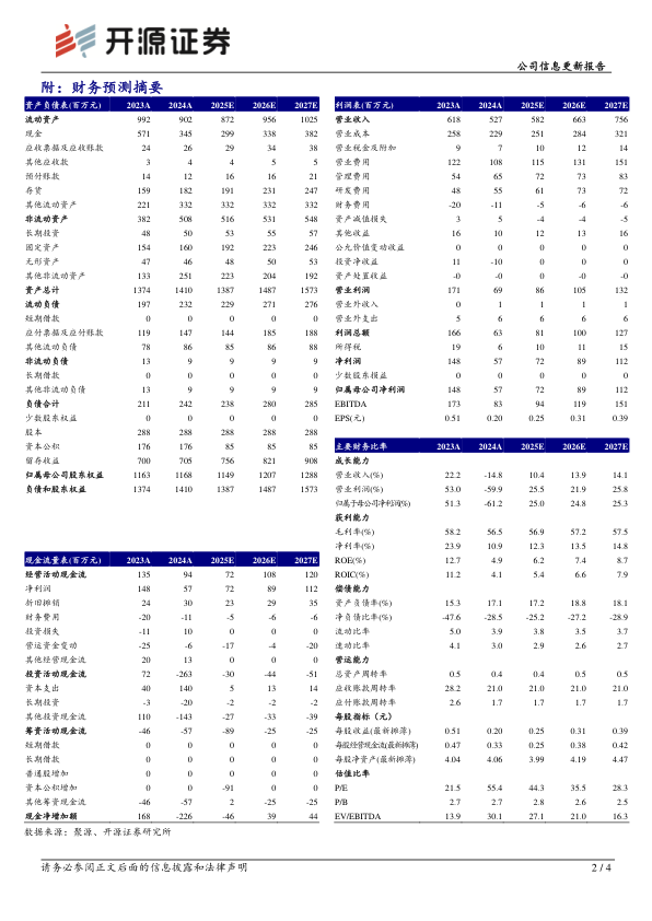 公司2024年实现营收5.27亿元(yoy-14.76%),归母净利润0.57亿元(yoy-61.21%),扣非归母净利润0.52亿元(yoy-59.39%),经营活动现金流净额0.94亿元(yoy-30.57%),主营业务毛利率56.47%(-1.73pct)。分产品,微创外科收入1.89亿元(yoy-22.97%),毛利率65.10%(-4.56pct);儿产科保育设备收入3.23亿(yoy-9.80%),毛利率51.64%(+1.71pct);分地区,国内收入2.97亿(yoy-27.56%),海外收入2.30亿(yoy+10.55%)。保育业务有四大积极因素—国内收入占比提高/疫情期间积累大量设备替换需求/设备更新换代高端化/贴息政策扶持;吻合器业务有三大积极因素—疫后手术量上升诊疗恢复/准入医院数量上升放量/海外依旧高增长。考虑到疫后手术量复苏进度及医保控费节奏,我们下调2025-2026年并新增2027年盈利预测,预计2025-2027年归母净利润分别为0.72/0.89/1.12亿元(原值2.50/3.26亿元),EPS分别为0.25/0.31/0.39元,当前股价对应P/E分别为44.3/35.5/28.3倍,但保育业务有存量更换升级需求长期惯性和吻合器集采政策有望推动放量,海外业务持续发力,本地化经营进展较快,因此维持“买入”评级。